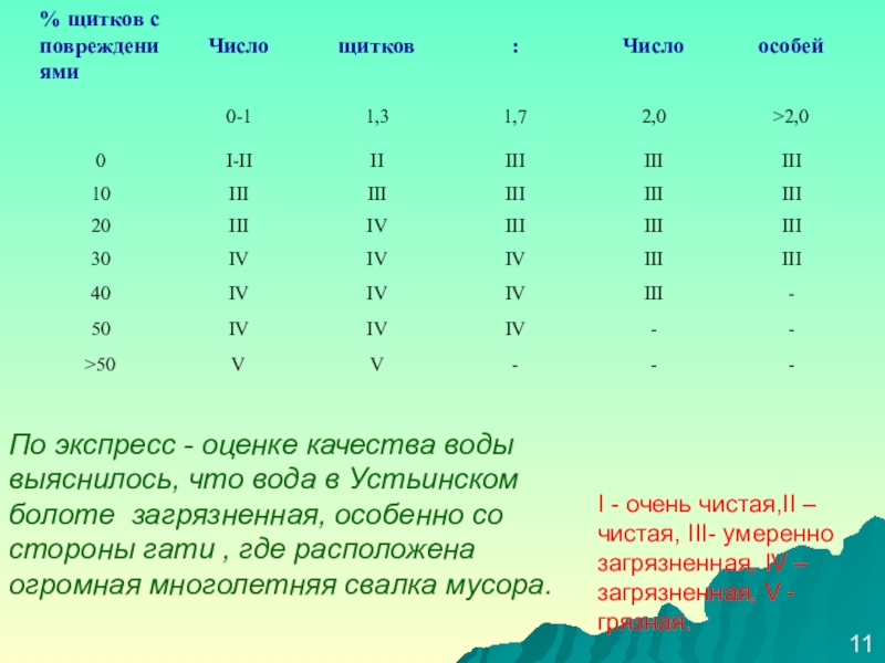 I - очень чистая,II – чистая, III- умеренно загрязненная, IV – загрязненная, V - грязная.