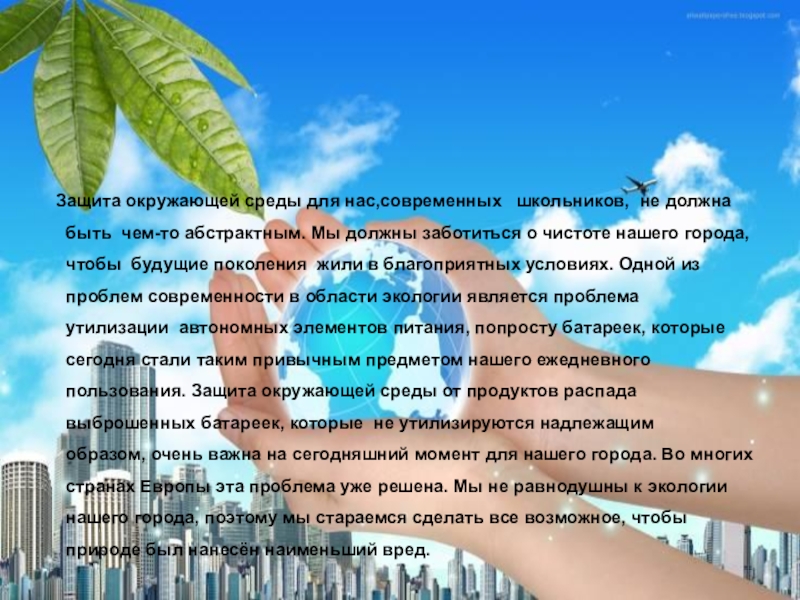 чем-то абстрактным. Мы должны заботиться о чистоте нашего города, чтобы  будущие поколения  жили в благоприятных условиях. Одной из проблем современности в области экологии является проблема утилизации  автономных элементов питания, попросту батареек, которые сегодня стали таким привычным предметом нашего ежедневного пользования. Защита окружающей среды от продуктов распада выброшенных батареек, которые  не утилизируются надлежащим образом, очень важна на сегодняшний момент для нашего города. Во многих странах Европы эта проблема уже решена. Мы не равнодушны к экологии нашего города, поэтому мы стараемся сделать все возможное, чтобы природе был нанесён наименьший вред.