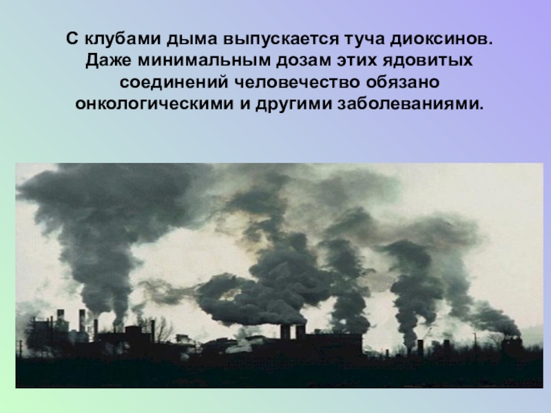 С клубами дыма выпускается туча диоксинов. Даже минимальным дозам этих ядовитых соединений человечество обязано онкологическими и другими