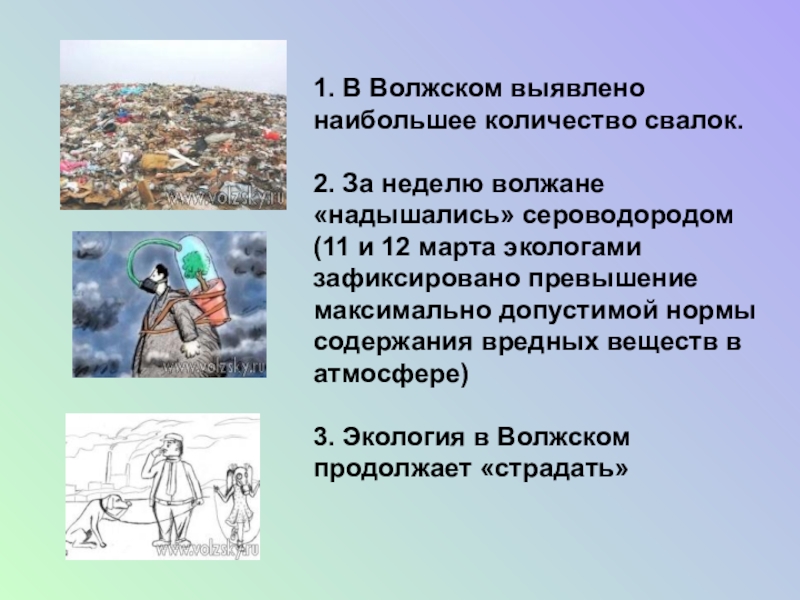 сероводородом(11 и 12 марта экологами зафиксировано превышение максимально допустимой нормы содержания вредных веществ в атмосфере) 3. Экология в Волжском продолжает «страдать»