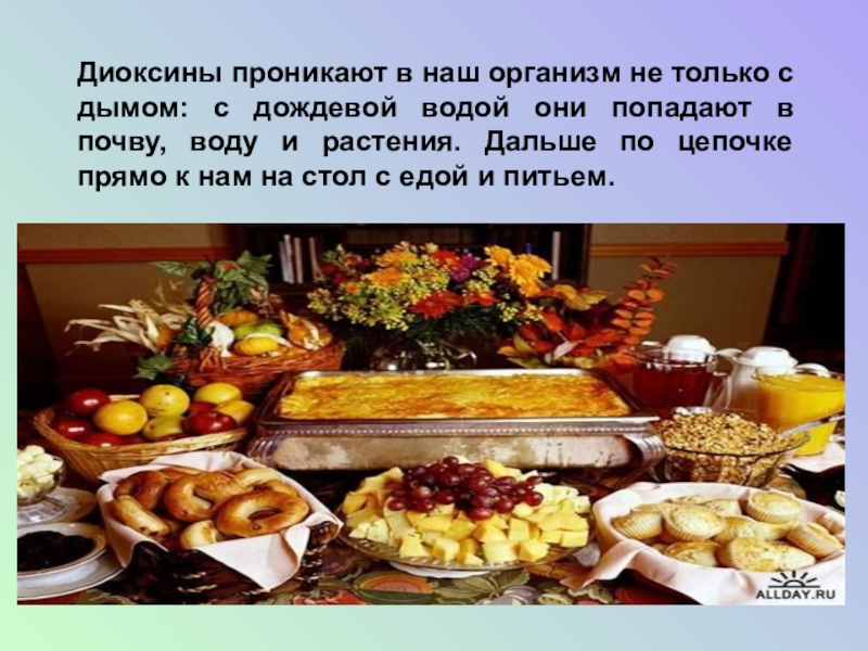 Диоксины проникают в наш организм не только с дымом: с дождевой водой они попадают в почву, воду