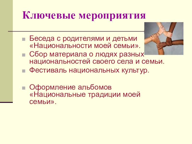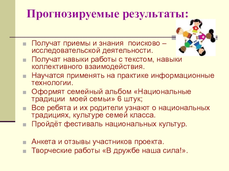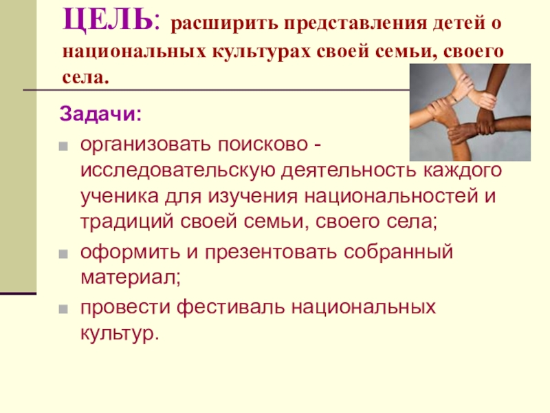 организовать поисково - исследовательскую деятельность каждого ученика для изучения национальностей и традиций своей семьи, своего села;