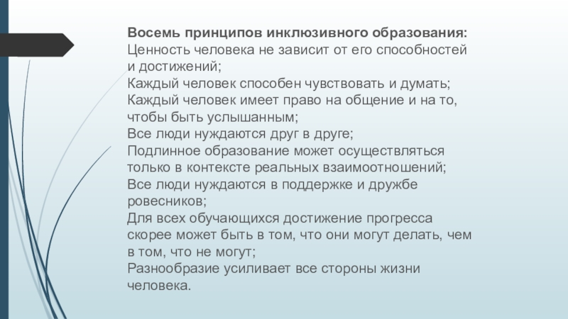 - Инклюзия подразумевает наличие тесных, близких, основанных на дружбе отношений между школами и обществом, в котором эти школы существуют и действуют.