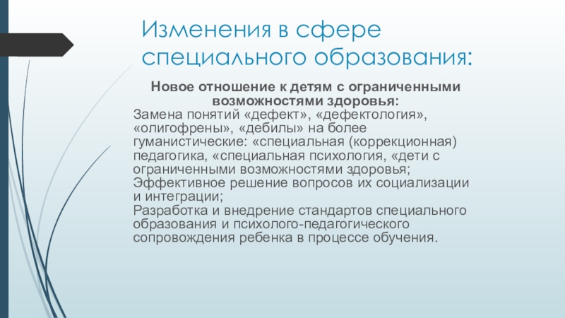 Замена понятий «дефект», «дефектология», «олигофрены», «дебилы» на более гуманистические: «специальная (коррекционная) педагогика, «специальная психология, «дети с ограниченными возможностями здоровья;