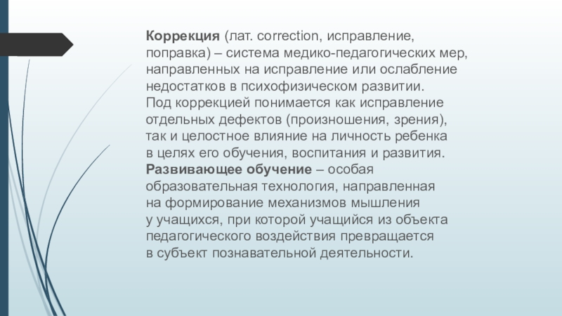 Слайд 12Коррекция (лат. сorrection, исправление, поправка) – система медико-педагогических мер, направленных на исправление или ослабление недостатков