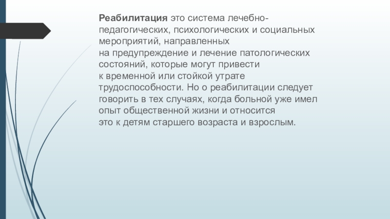 которые могут привести к временной или стойкой утрате трудоспособности. Но о реабилитации следует говорить в тех случаях, когда больной уже имел опыт общественной жизни и относится это к детям старшего возраста и взрослым.