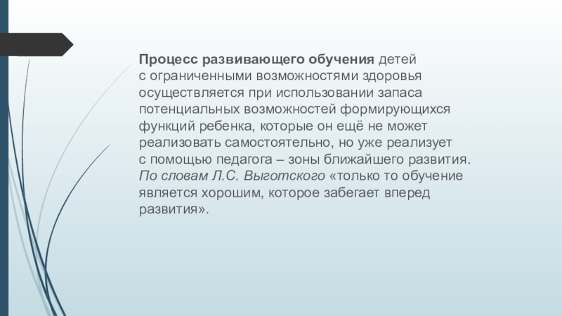 Слайд 13Процесс развивающего обучения детей с ограниченными возможностями здоровья осуществляется при использовании запаса потенциальных возможностей