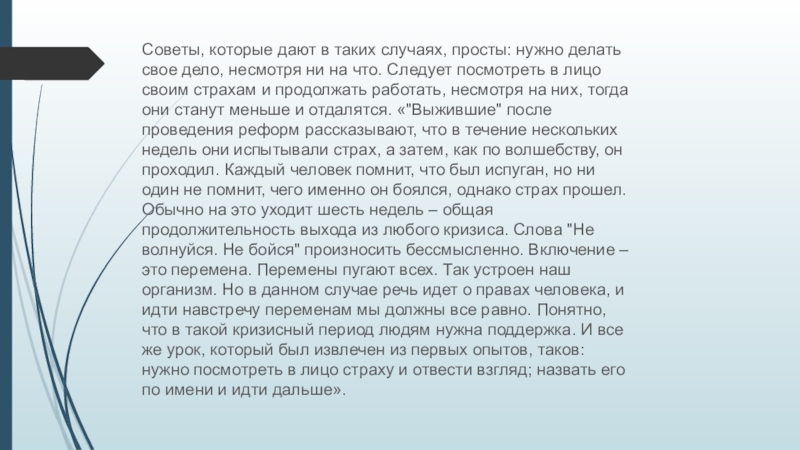 несмотря ни на что. Следует посмотреть в лицо своим страхам и продолжать работать, несмотря на них, тогда они станут меньше и отдалятся. «"Выжившие" после проведения реформ рассказывают, что в течение нескольких недель они испытывали страх, а затем, как по волшебству, он проходил. Каждый человек помнит, что был испуган, но ни один не помнит, чего именно он боялся, однако страх прошел. Обычно на это уходит шесть недель – общая продолжительность выхода из любого кризиса. Слова "Не волнуйся. Не бойся" произносить бессмысленно. Включение – это перемена. Перемены пугают всех. Так устроен наш организм. Но в данном случае речь идет о правах человека, и идти навстречу переменам мы должны все равно. Понятно, что в такой кризисный период людям нужна поддержка. И все же урок, который был извлечен из первых опытов, таков: нужно посмотреть в лицо страху и отвести взгляд; назвать его по имени и идти дальше».