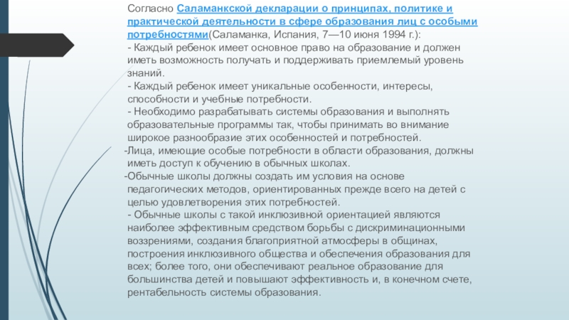 Слайд 6Согласно Саламанкской декларации о принципах, политике и практической деятельности в сфере образования