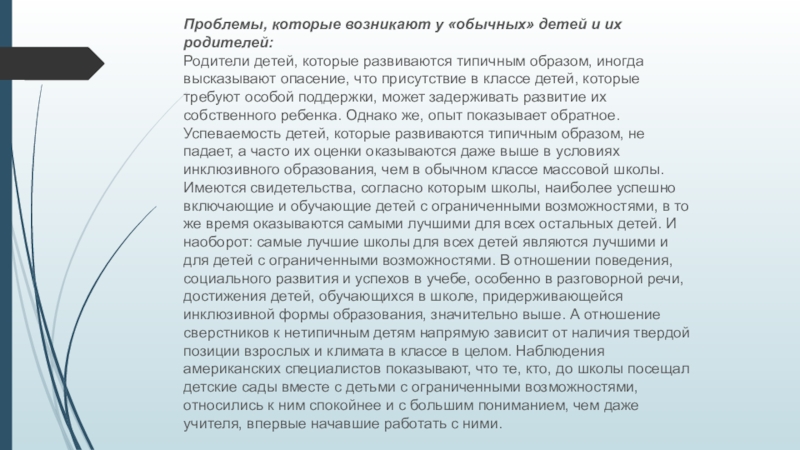 развиваются типичным образом, иногда высказывают опасение, что присутствие в классе детей, которые требуют особой поддержки, может задерживать развитие их собственного ребенка. Однако же, опыт показывает обратное. Успеваемость детей, которые развиваются типичным образом, не падает, а часто их оценки оказываются даже выше в условиях инклюзивного образования, чем в обычном классе массовой школы. Имеются свидетельства, согласно которым школы, наиболее успешно включающие и обучающие детей с ограниченными возможностями, в то же время оказываются самыми лучшими для всех остальных детей. И наоборот: самые лучшие школы для всех детей являются лучшими и для детей с ограниченными возможностями. В отношении поведения, социального развития и успехов в учебе, особенно в разговорной речи, достижения детей, обучающихся в школе, придерживающейся инклюзивной формы образования, значительно выше. А отношение сверстников к нетипичным детям напрямую зависит от наличия твердой позиции взрослых и климата в классе в целом. Наблюдения американских специалистов показывают, что те, кто, до школы посещал детские сады вместе с детьми с ограниченными возможностями, относились к ним спокойнее и с большим пониманием, чем даже учителя, впервые начавшие работать с ними.
