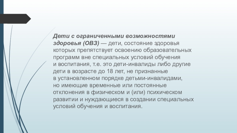 Слайд 11Дети с ограниченными возможностями здоровья (ОВЗ) — дети, состояние здоровья которых препятствует освоению образовательных