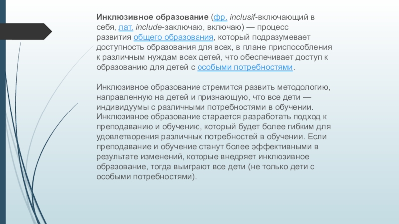 Слайд 4Инклюзивное образование (фр. inclusif-включающий в себя, лат. include-заключаю, включаю) — процесс развития общего образования, который подразумевает