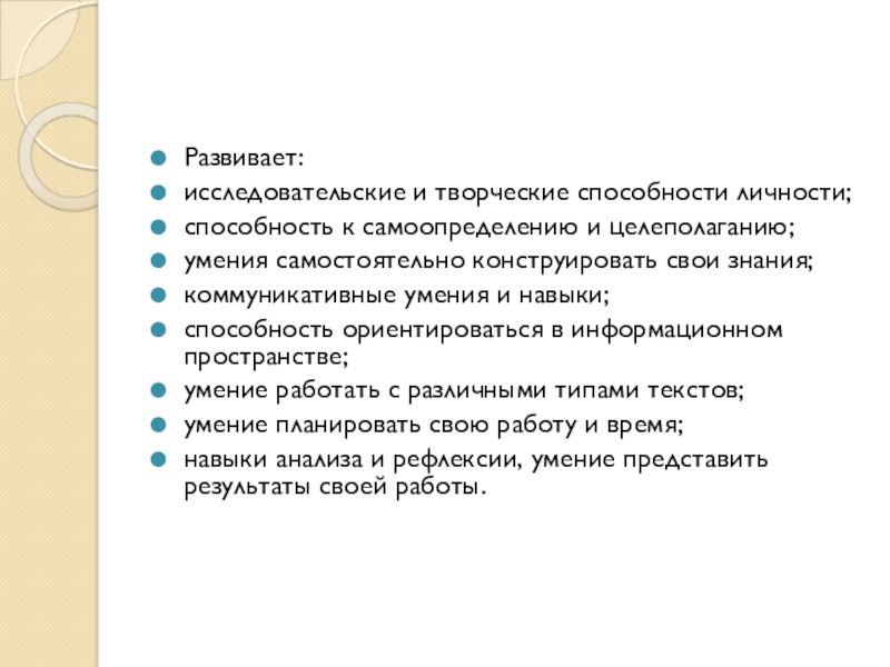 Развивает:исследовательские и творческие способности личности;способность к самоопределению и целеполаганию;умения самостоятельно конструировать свои знания;коммуникативные умения и навыки;способность ориентироваться