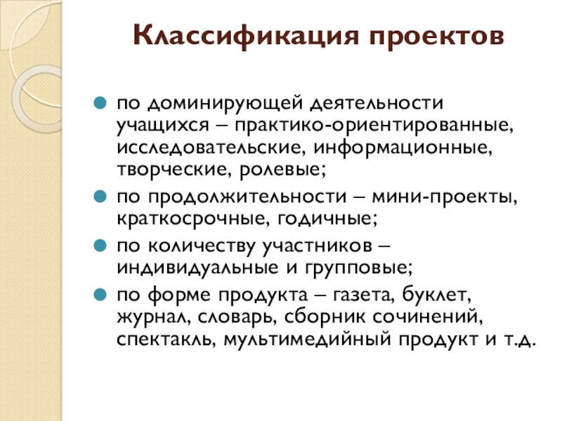 Классификация проектов по доминирующей деятельности учащихся – практико-ориентированные, исследовательские, информационные, творческие, ролевые;по продолжительности – мини-проекты, краткосрочные, годичные;по