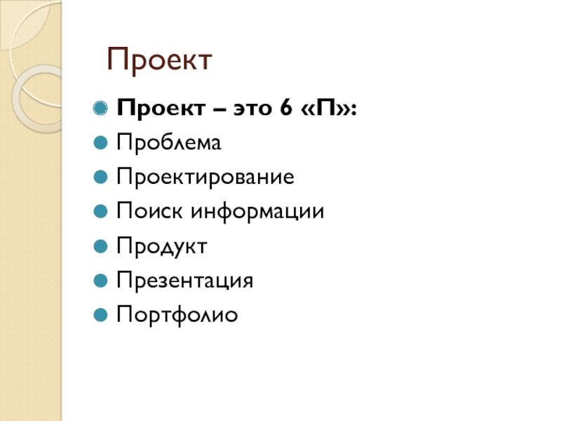 Проект Проект – это 6 «П»:ПроблемаПроектированиеПоиск информацииПродуктПрезентацияПортфолио