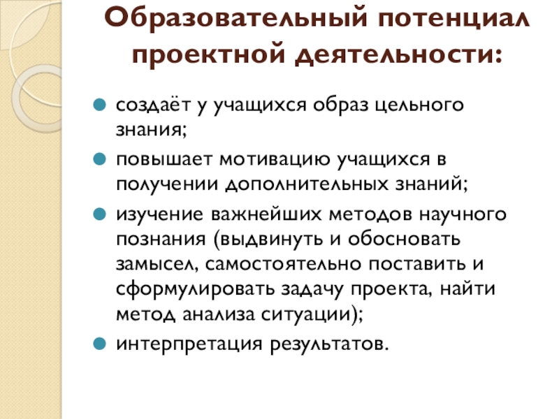 Слайд 5Образовательный потенциал проектной деятельности: