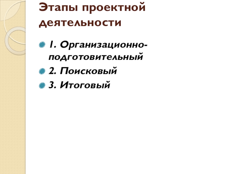 Этапы проектной деятельности 1. Организационно-подготовительный2. Поисковый3. Итоговый