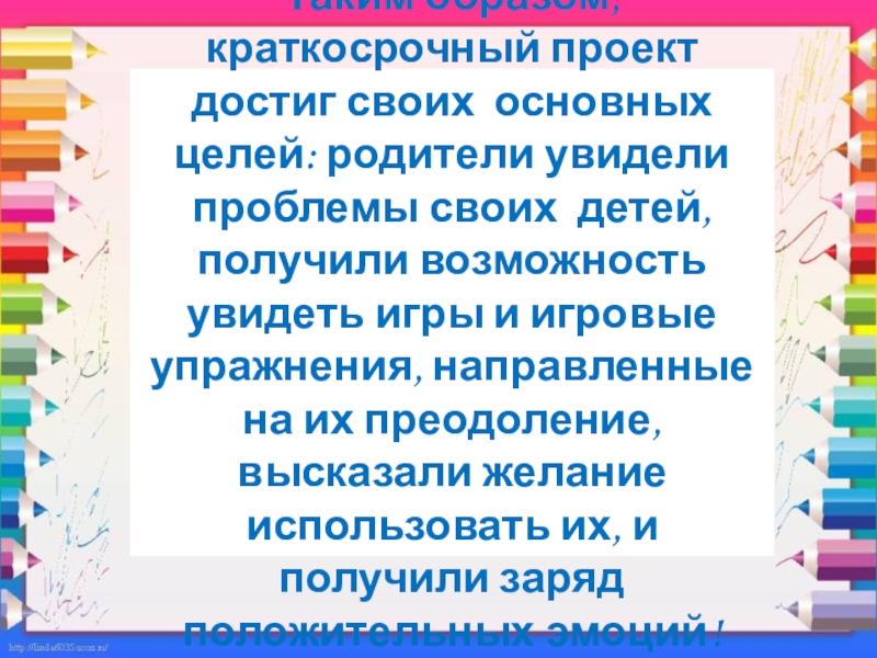 Таким образом, краткосрочный проект достиг своих основных целей: родители увидели проблемы своих детей, получили возможность