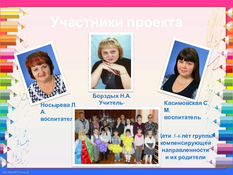 Участники проектаБорздых Н.А. Учитель-логопедНосырева Л.А.воспитательКасимовская С.М.воспитательДети 5-6 лет группы компенсирующей направленности и их родители