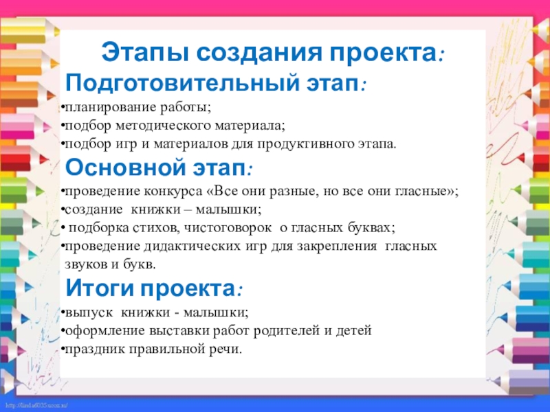 Этапы создания проекта:Подготовительный этап:планирование работы;подбор методического материала;подбор игр и материалов для продуктивного этапа.Основной этап:проведение конкурса «Все они