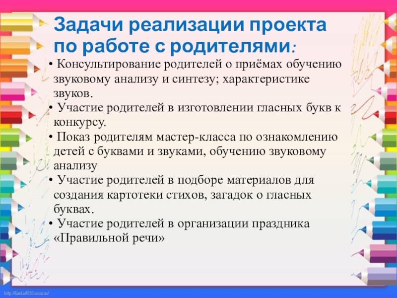 Задачи реализации проекта по работе с родителями: Консультирование родителей о приёмах обучению звуковому анализу и синтезу; характеристике