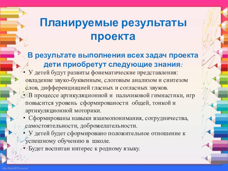 У детей будут развиты фонематические представления: овладение звуко-буквенным, слоговым анализом и синтезом слов, дифференциацией гласных и согласных звуков.