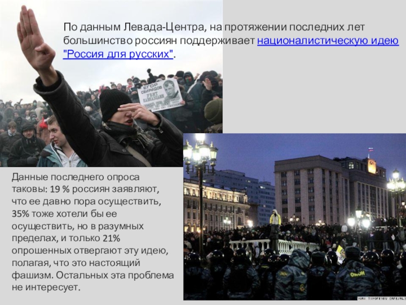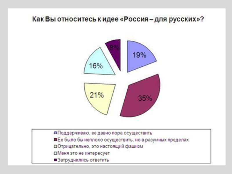 Данные последнего опроса таковы: 19 % россиян заявляют, что ее давно пора осуществить, 35% тоже хотели бы ее осуществить, но в разумных пределах, и только 21% опрошенных отвергают эту идею, полагая, что это настоящий фашизм. Остальных эта проблема не интересует.