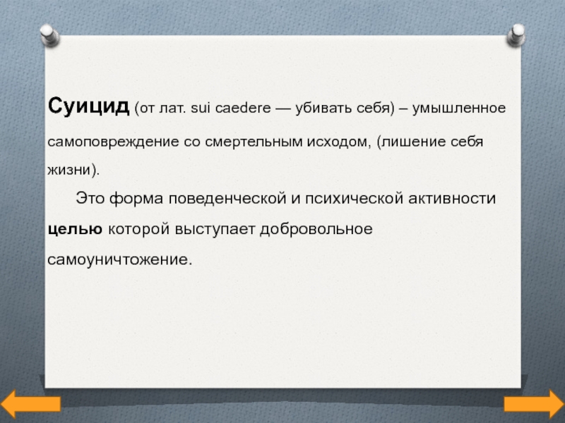 Это форма поведенческой и психической активности целью которой выступает добровольное самоуничтожение.