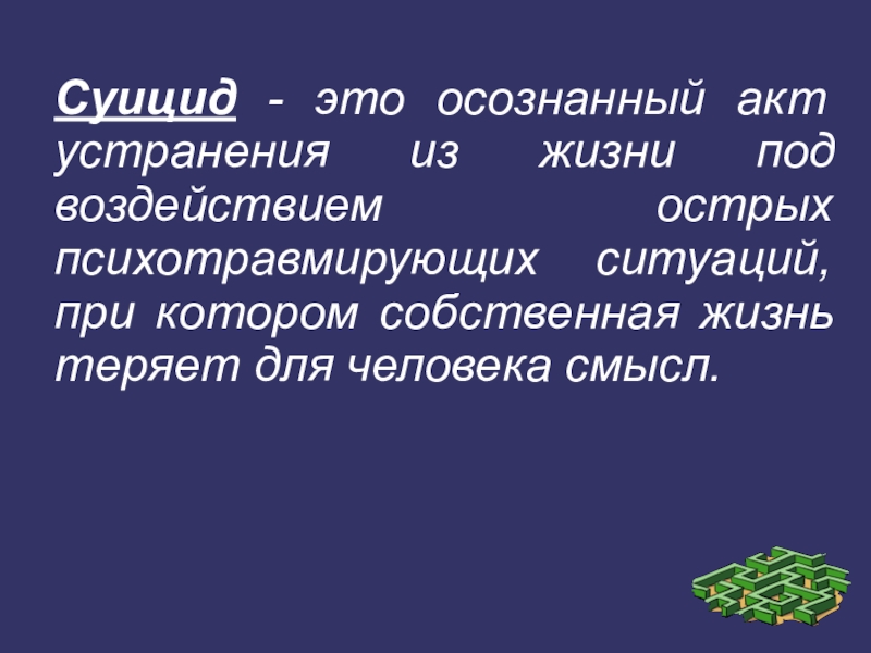 Слайд 2Суицид - это осознанный акт устранения из жизни под воздействием острых