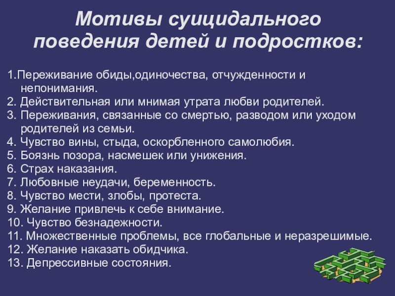 Слайд 4Мотивы суицидального поведения детей и подростков: