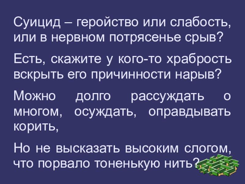 Слайд 14Суицид – геройство или слабость, или в нервном потрясенье срыв?