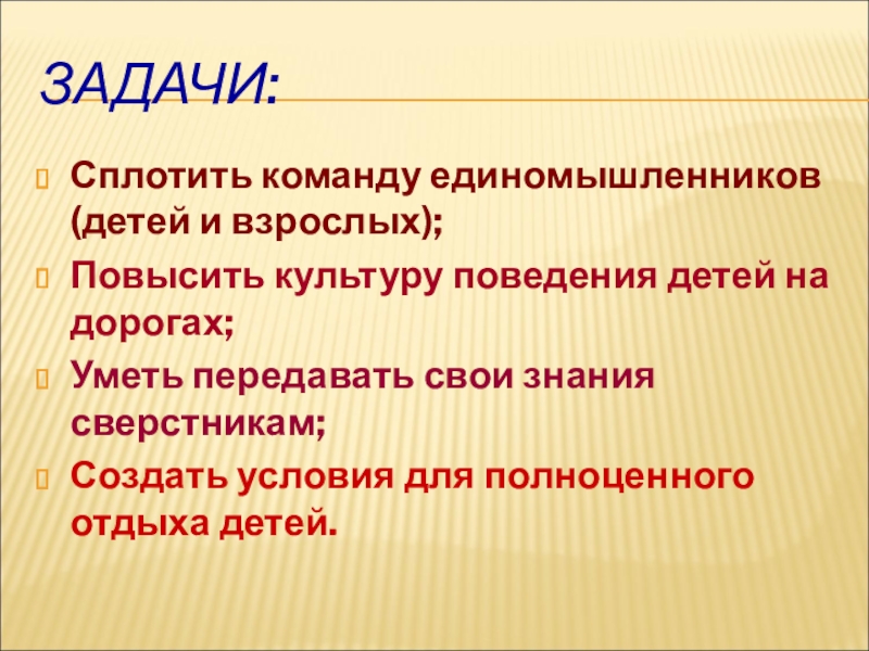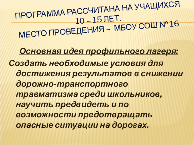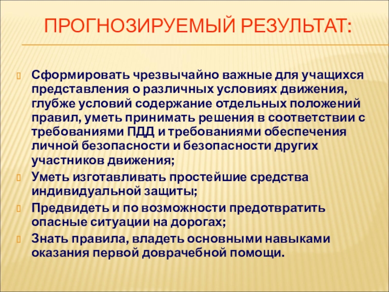 Создать необходимые условия для достижения результатов в снижении дорожно-транспортного травматизма среди школьников, научить предвидеть и по возможности предотвращать опасные ситуации на дорогах.