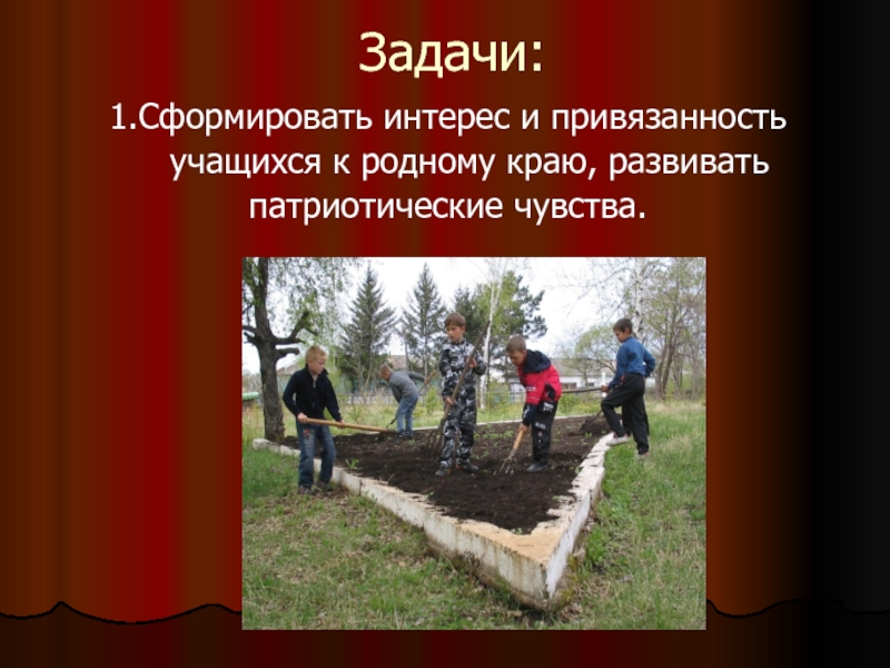 Задачи:1.Сформировать интерес и привязанность  учащихся к родному краю, развивать патриотические чувства.
