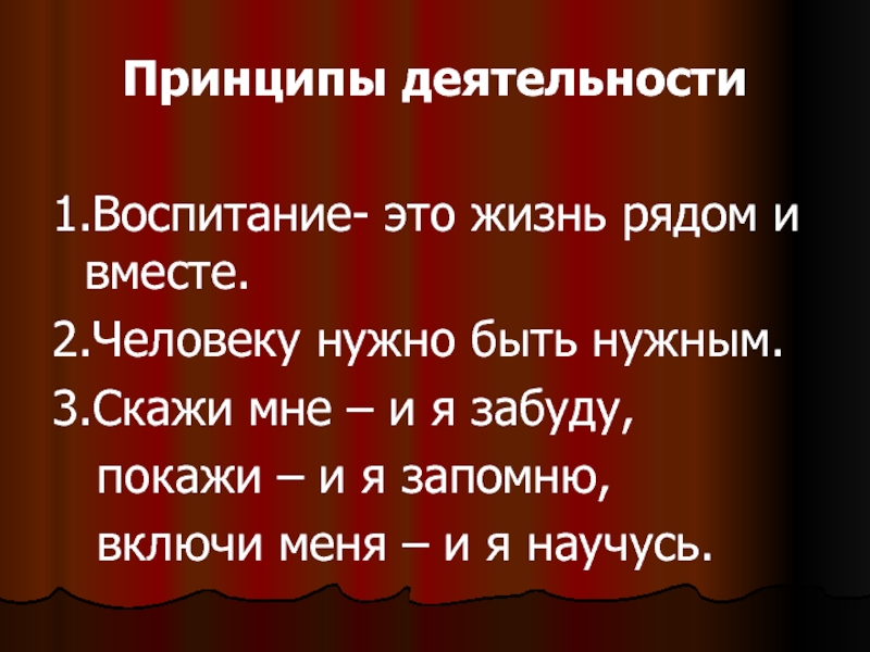 Принципы деятельности1.Воспитание- это жизнь рядом и вместе.2.Человеку нужно быть нужным.3.Скажи мне – и я забуду,  покажи