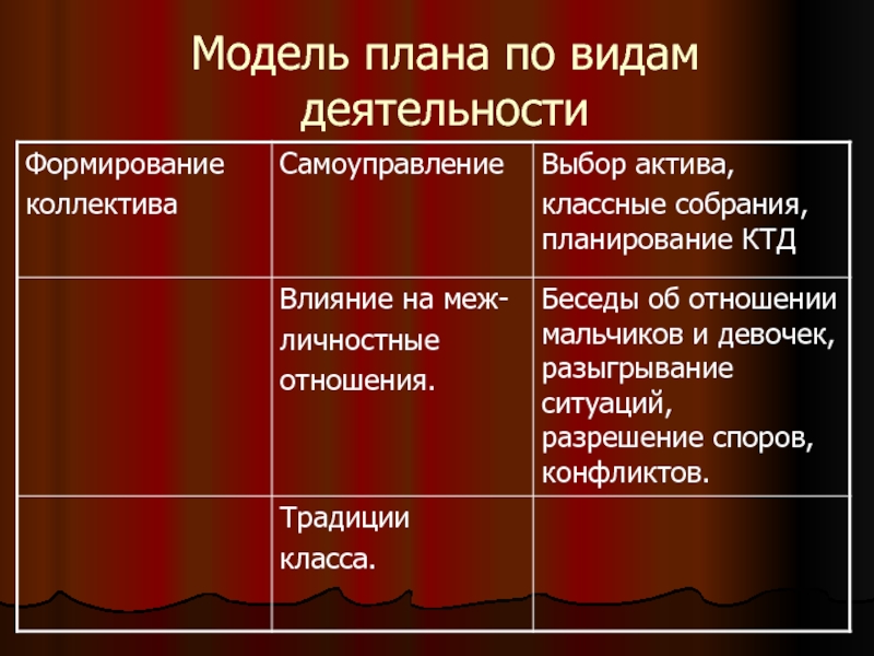 Слайд 9Модель плана по видам деятельности