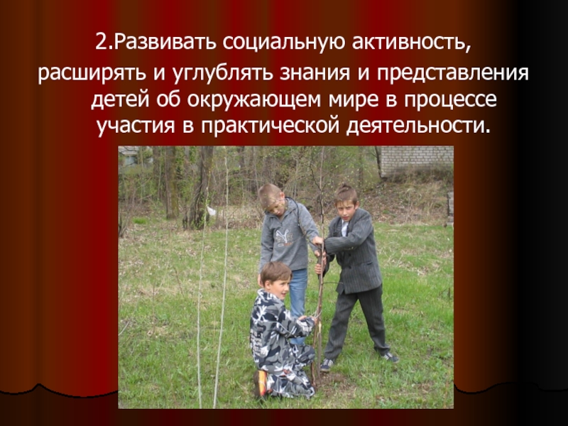 2.Развивать социальную активность,расширять и углублять знания и представления детей об окружающем мире в процессе участия в практической