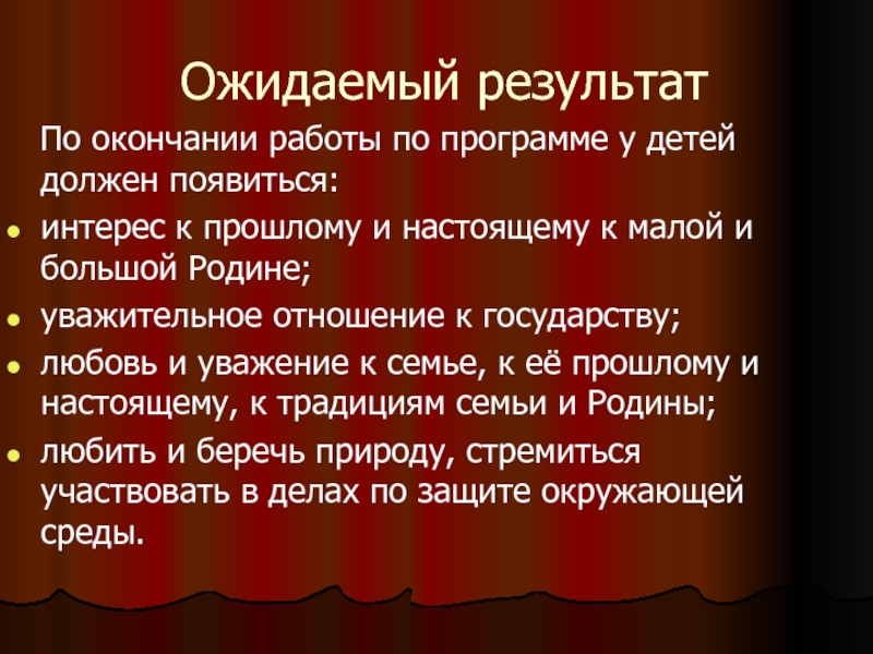 Ожидаемый результат  По окончании работы по программе у детей должен появиться:интерес к прошлому и настоящему к
