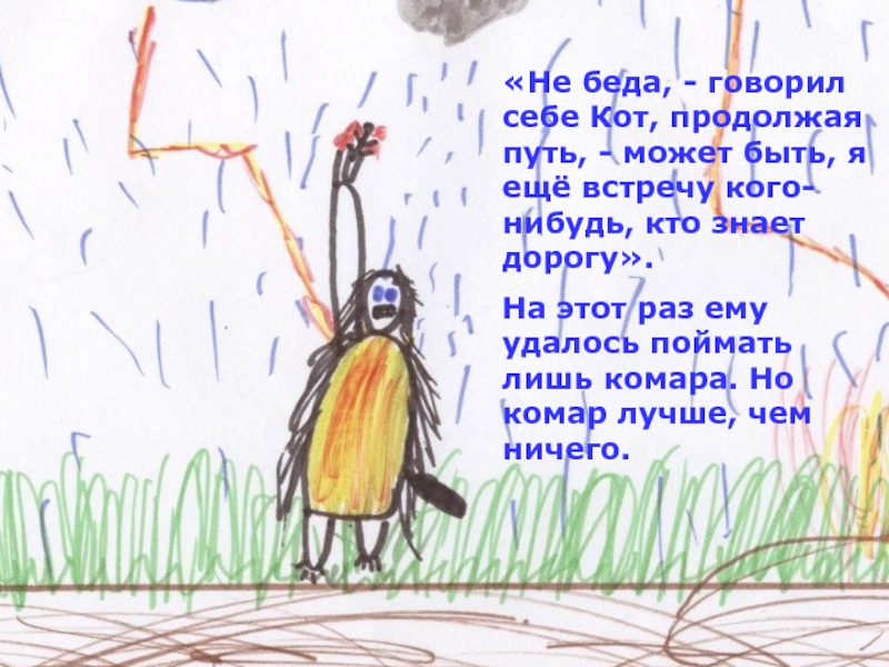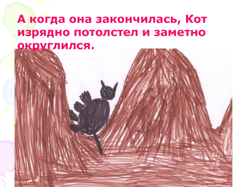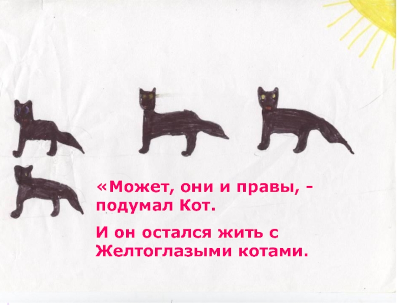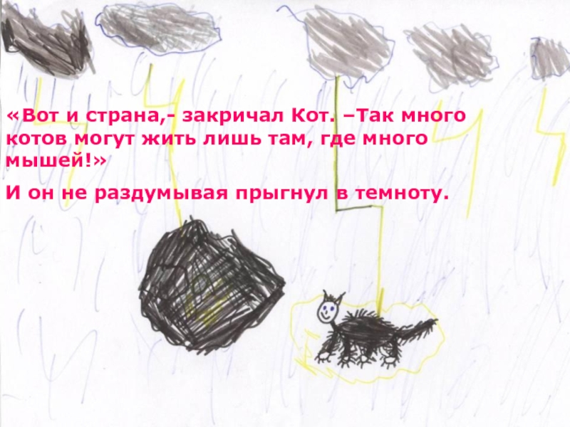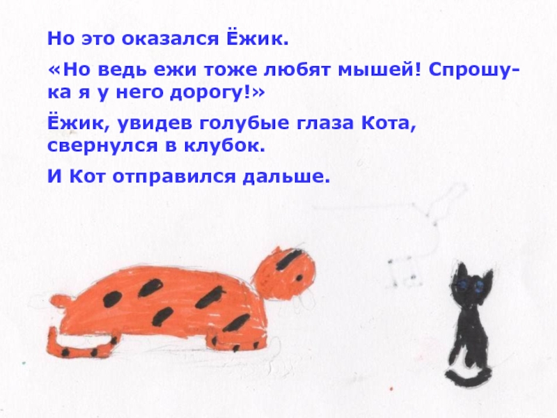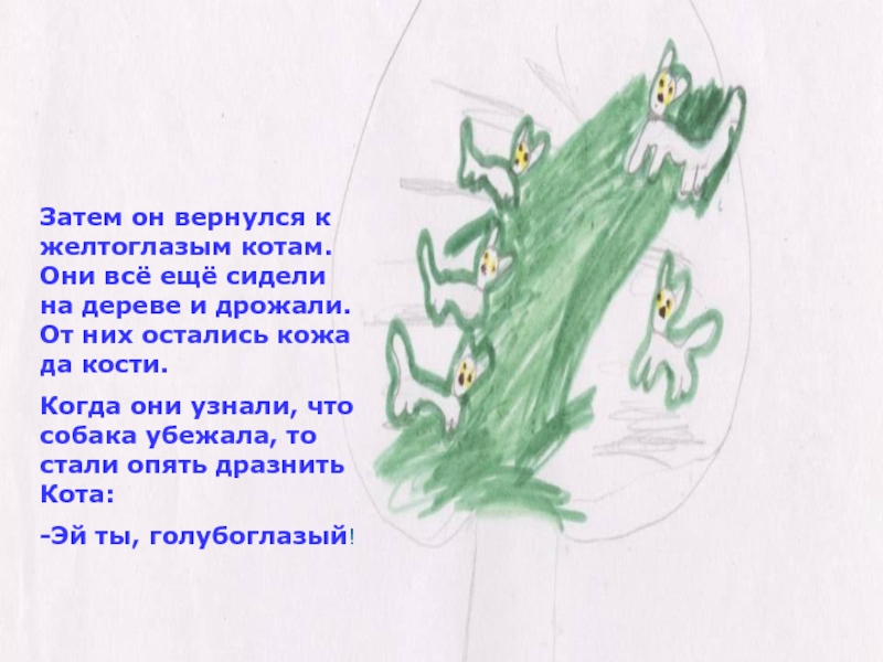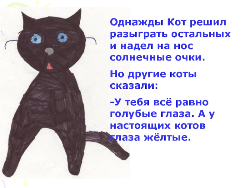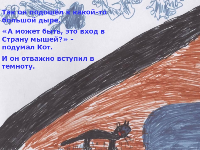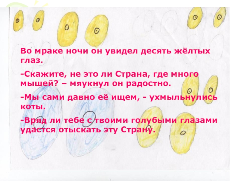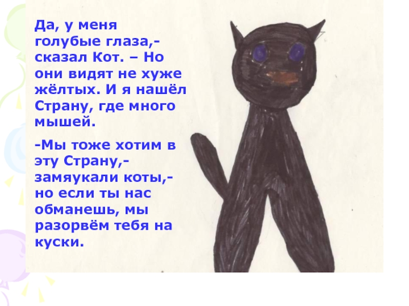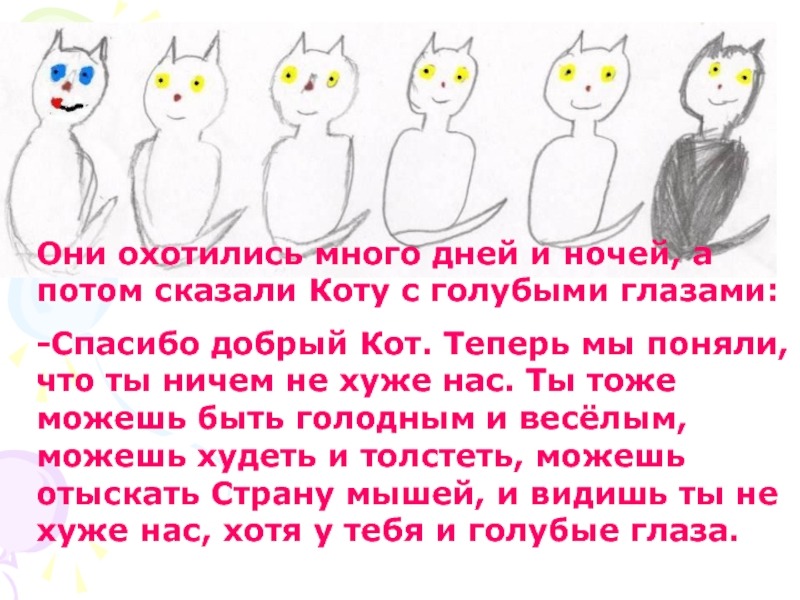 -Спасибо добрый Кот. Теперь мы поняли, что ты ничем не хуже нас. Ты тоже можешь быть голодным и весёлым, можешь худеть и толстеть, можешь отыскать Страну мышей, и видишь ты не хуже нас, хотя у тебя и голубые глаза.