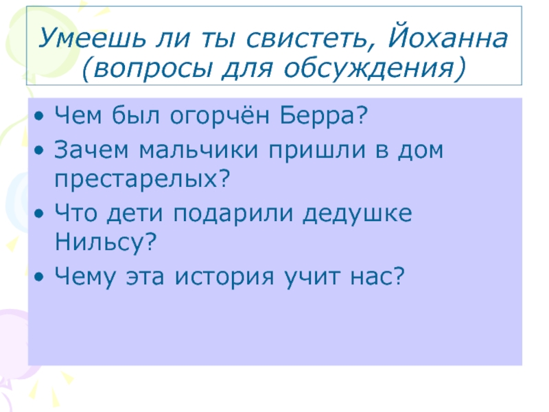 Слайд 54Умеешь ли ты свистеть, Йоханна (вопросы для обсуждения)