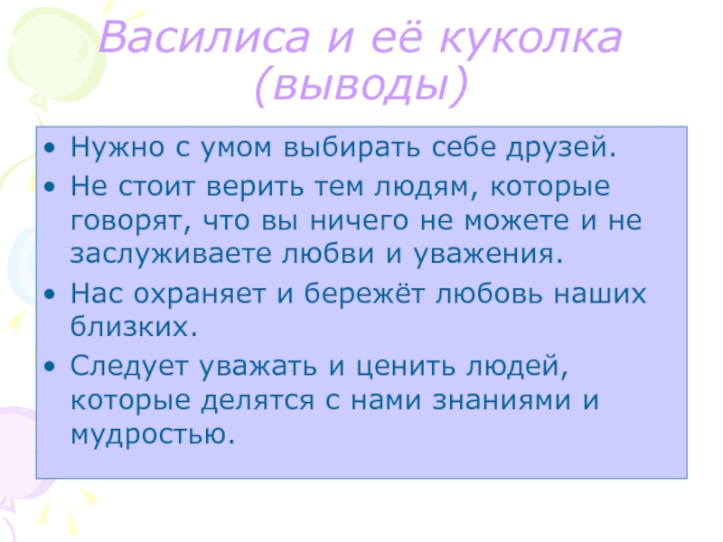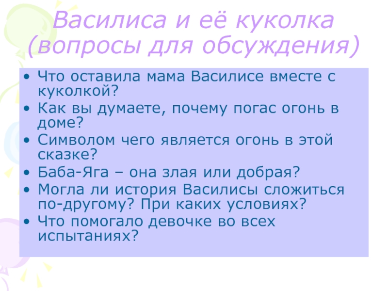 Слайд 11Василиса и её куколка (вопросы для обсуждения)