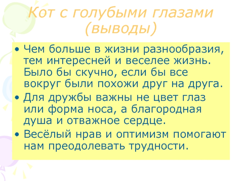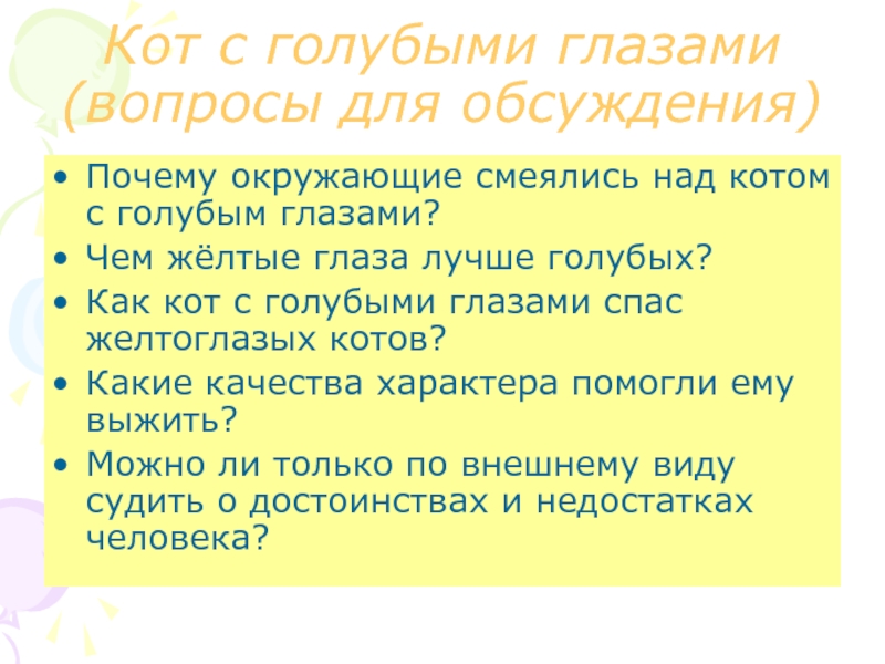 Слайд 23Кот с голубыми глазами (вопросы для обсуждения)