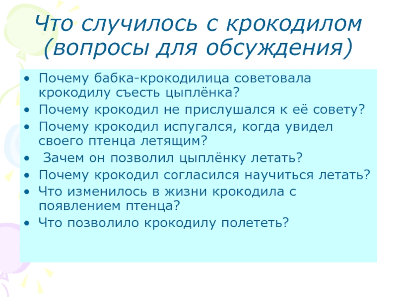 Слайд 15Что случилось с крокодилом (вопросы для обсуждения)