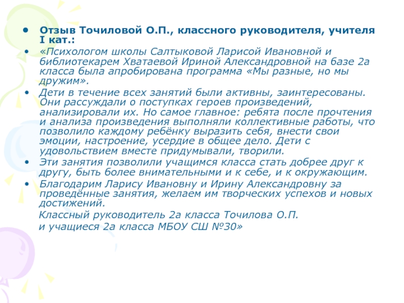 Слайд 8Отзыв Точиловой О.П., классного руководителя, учителя I кат.: