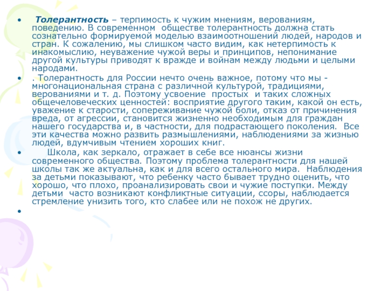 Школа, как зеркало, отражает в себе все нюансы жизни современного общества. Поэтому проблема толерантности для нашей школы так же актуальна, как и для всего остального мира. Наблюдения за детьми показывают, что ребенку часто бывает трудно оценить, что хорошо, что плохо, проанализировать свои и чужие поступки. Между детьми часто возникают конфликтные ситуации, ссоры, наблюдается стремление унизить того, кто слабее или не похож не других.