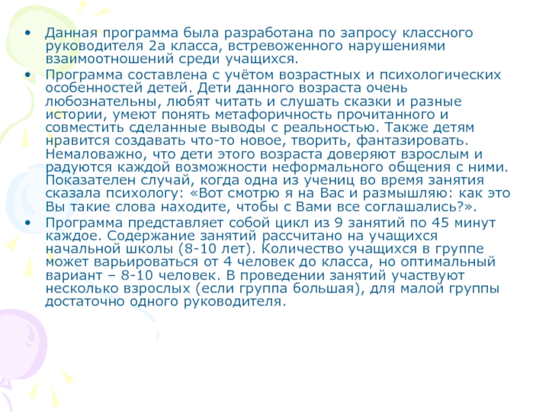 Слайд 5Данная программа была разработана по запросу классного руководителя 2а класса, встревоженного