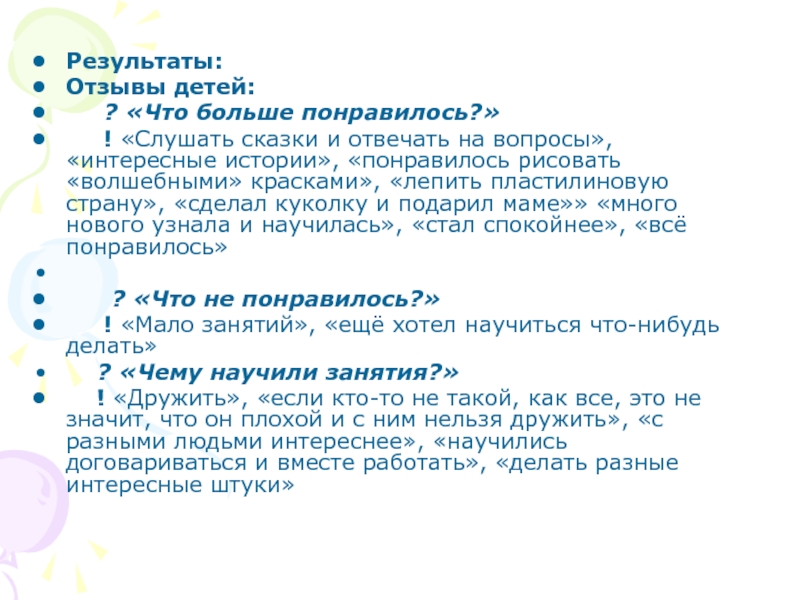 «Слушать сказки и отвечать на вопросы», «интересные истории», «понравилось рисовать «волшебными» красками», «лепить пластилиновую страну», «сделал куколку и подарил маме»» «много нового узнала и научилась», «стал спокойнее», «всё понравилось»