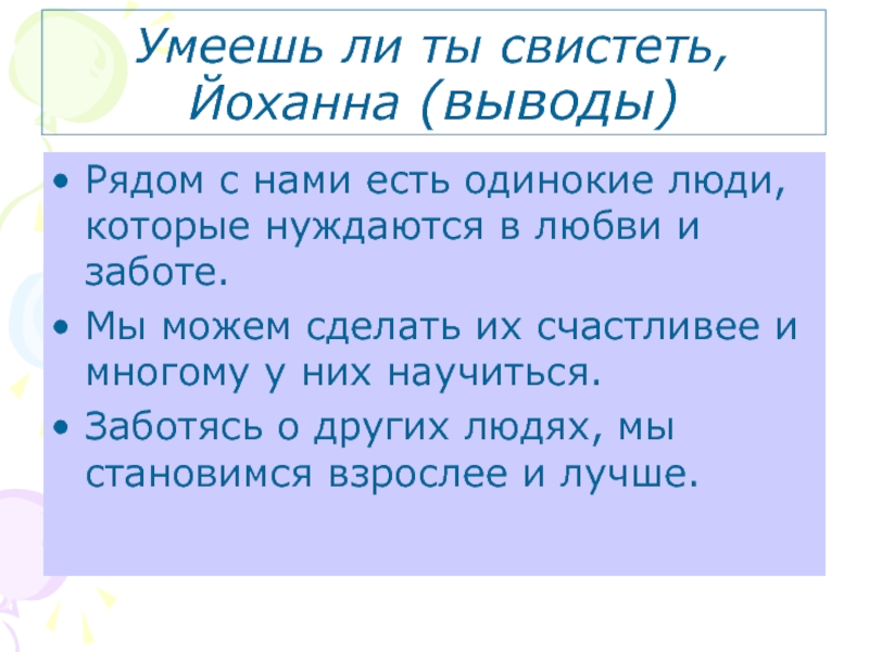 Слайд 56Умеешь ли ты свистеть, Йоханна (выводы)