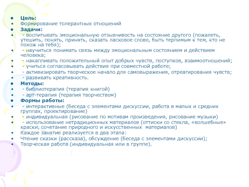 - активизировать творческое начало для самовыражения, отреагирования чувств;