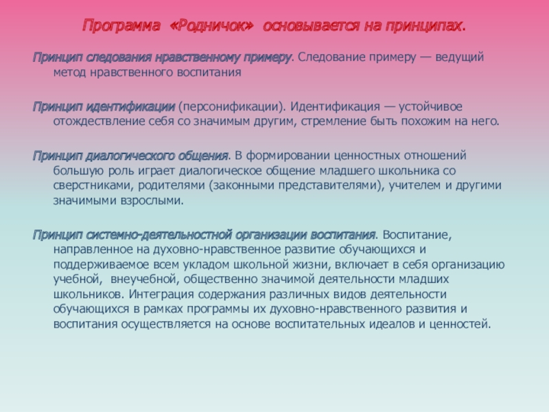 Принцип системно-деятельностной организации воспитания. Воспитание, направленное на духовно-нравственное развитие обучающихся и поддерживаемое всем укладом школьной жизни, включает в себя организацию учебной, внеучебной, общественно значимой деятельности младших школьников. Интеграция содержания различных видов деятельности обучающихся в рамках программы их духовно-нравственного развития и воспитания осуществляется на основе воспитательных идеалов и ценностей.