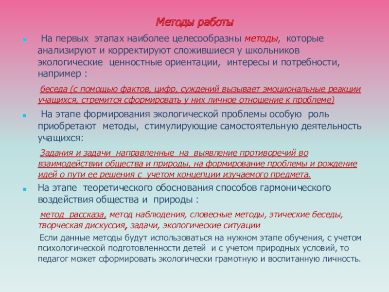 Если данные методы будут использоваться на нужном этапе обучения, с учетом психологической подготовленности детей и с учетом природных условий, то педагог может сформировать экологически грамотную и воспитанную личность.
